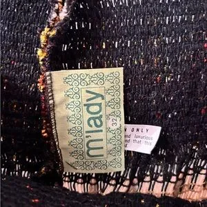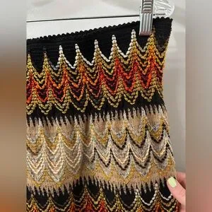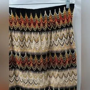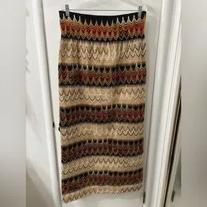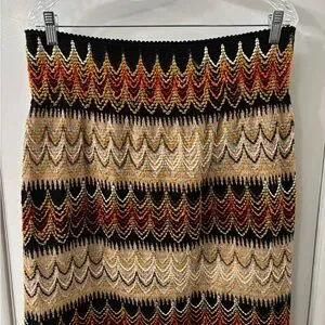 Stand out in this gorgeous and unique, vintage 1960s M’lady maxi skirt, handwoven. Burnt orange, black, gold threads, light blue, red colors, about 17.5 inch across at the waist with stretch, 44 inches top to bottom, slit in the back. Really love this piece! Great condition!