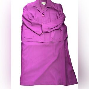 Bold magenta skirt suit. Features a button-front jacket with patch pockets. Smooth, wrinkle-resistant fabric. Classic loveseat silhouette. Bright, eye-catching color. In good used condition. Necklace is used as prop purposes only. Measurements are Jacket length 30 inches, pit to pit 27 inches, pit to sleeve 16.5 inches, shoulder to sleeve 24 inches. Dress length is 46 inches, pit to pit 26 inches.