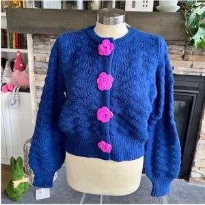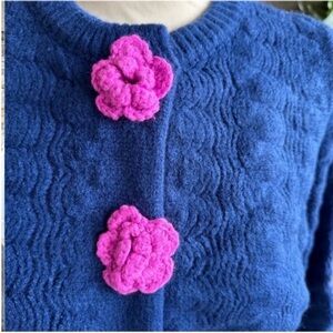Discover elegance with this beautiful blue cardigan, featuring charming pink floral details. A perfect addition to your wardrobe for a stylish look.