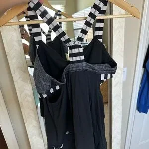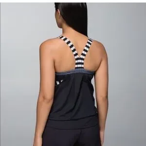 Chic black tank with bold striped straps. Ideal for active or casual wear. In perfect condition! Has a built in bra! So cute! #lululemon #activewear #workout #running #coquette