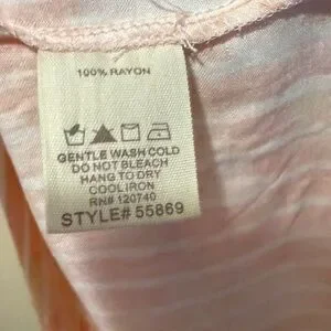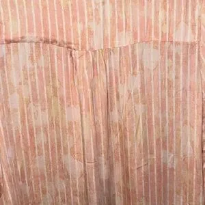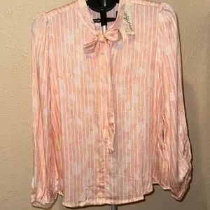Chic blouse with bow tie accent. Soft peach blush and cream stripes with lighter prints throughout. This is a flowy feminine blouse.