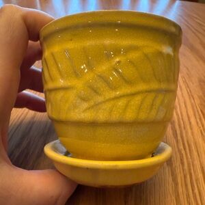 Vintage Yellow Ceramic Leaf Pattern Planter with Saucer Bottom