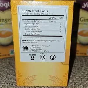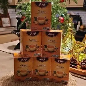 6 New Boxes of Yogi Ginger Tea. Supports healthy digestion. Caffeine free. Yogi Ginger Tea is a popular organic, caffeine-free herbal tea known for its spicy, warming blend of ginger, lemongrass, peppermint, and black pepper, traditionally used to support healthy digestion and promote balance, offering a naturally delicious way to warm up or soothe your stomach. It's USDA certified organic, vegan, and comes in compostable bags, with some users adding honey for extra sweetness, though licorice root in the blend provides natural sweetness.