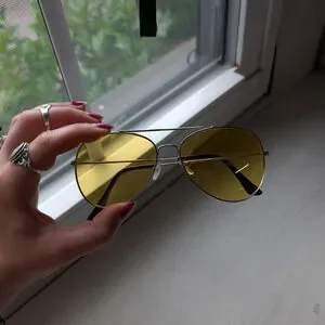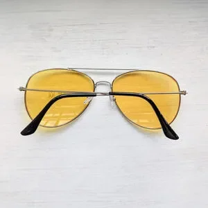 Love these gorgeous aviator shades. 70s almost famous does 90s baddie chic vibes. Very groovy retro color pop. Lightweight silver metal aviator style frame, unique amber yellow colored lenses. Super chic, tint is light enough to be worn inside and at night. Minimal clean look, comfortable plastic padded metal nose pieces. Lenses are clean, hardware is tight. New without tags NWOT