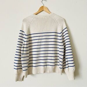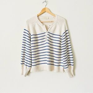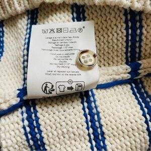 Sezane Leontine striped henley neck jumper knit sweater in Limited Release color ‘Ecru / Bright Blue’ (the close-ups show the color better)