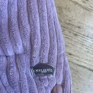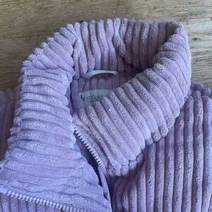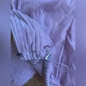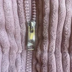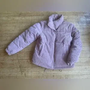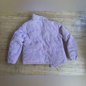 This coat is so so soft and warm. The ribbing is think and wide and very soft. This coat is unique and definitely a conversation piece. She will keep you warm and cozy. The color is somewhere between a pink and a lilac.