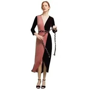 Ooh la la -- this MISA Los Angeles wrap dress will steal the show! A luxe velvet color blocked dress with fun burgundy and blush hues is the perfect addition to your closet. A true wrap with a sexy V-neckline, flowy hem, and long sleeves complete the design. Style this number for your next holiday event with metallic heels and a sparkly statement earring, and don't forget to pop the bubbly!