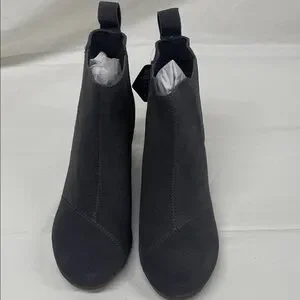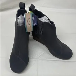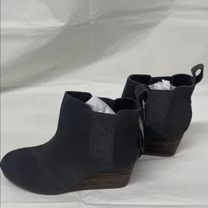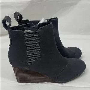 Suede wedge booties by TOMS. Elastic side panels for easy slip-on. Cushioned insole for comfort. Stacked wedge heel for added lift. Versatile, modern silhouette.