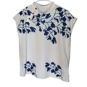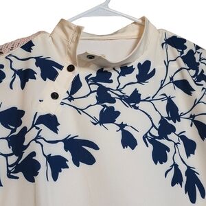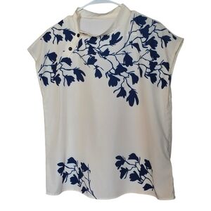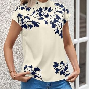 Ivory short-sleeve blouse featuring a navy floral print for a polished look. Lightweight, breathable fabric with a modest high neckline and button accents. Easy-to-style piece that pairs well with jeans or skirts. Ivory color with navy floral detailing for refined, everyday wear.