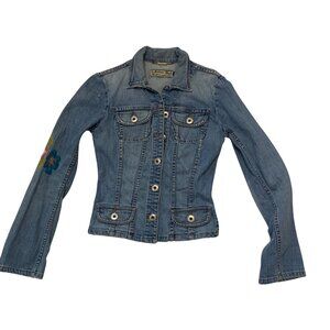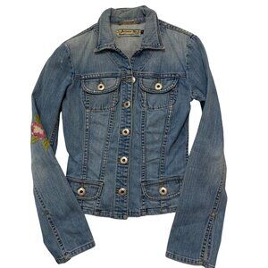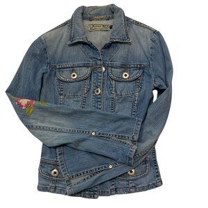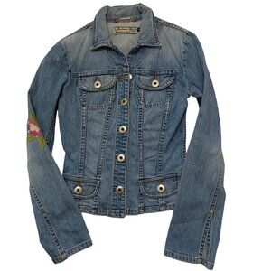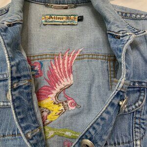 This denim jacket from Allen B. combines timeless style with intricate embroidery depicting a vibrant bird and flourishing flowers. The light blue denim fabric is accentuated by its button-up design and tailored fit, creating a versatile garment that's both fashionable and functional. Its long sleeves and durable material make it a staple for any wardrobe.