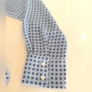 Lightweight silk-blend blouse. V-neck with long sleeves and cuffed wrists. All-over small geometric print. Soft drape and tailored seams. Versatile for work or casual wear.