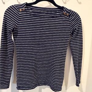 Striped 3/4 sleeve boat neck J Crew painter tee with gold hardware embellishments on shoulders