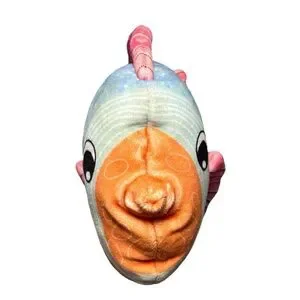 Soft plush fish with a playful face. Bright orange snout and patterned blue body. Textured pink fins add visual interest. Gentle stuffing for cuddles and play. Appealing design for pets and decor.