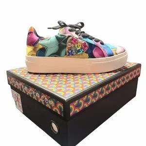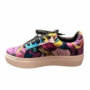 Bold multicolor satin upper. Cream platform sole. Black laces. Decorative crystal heart detail. Trendy designer sneaker. Multicolor