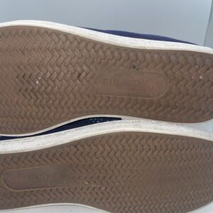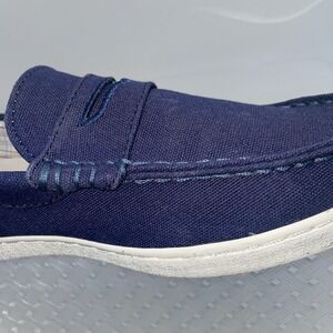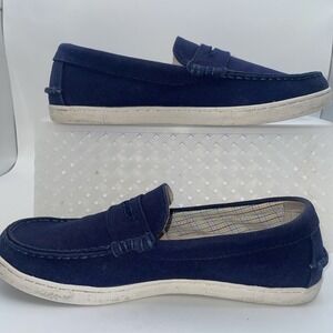The Cole Haan Pinch Maine Classic Navy Canvas Slip On Penny Loafers Shoes in size 8.5 are a stylish and comfortable option for men's casual footwear. These solid blue loafers feature a round toe shape and slip-on closure, making them easy to wear for various occasions such as travel, activewear, and everyday casual wear. The canvas lining and rubber outsole provide added comfort and cushioning, while the signature Cole Haan logo accent adds a touch of sophistication. Perfect for all seasons, these loafers are a versatile addition to any wardrobe.K8