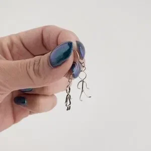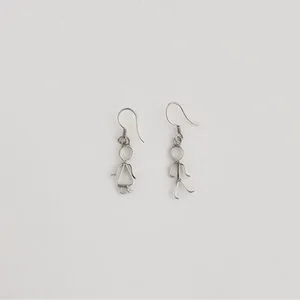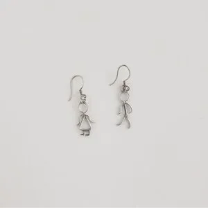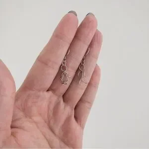 Vintage figural dangle drop earrings. Earring set depicts a boy and a girl. Wire work design. Cute, small, dainty, minimalist. Hook closure for pierced ears. Tested positive for sterling silver, however unmarked. Selling as silver plated. Pre-owned with normal vintage wear such as light surface scratches and plating loss, not noticeable. Please refer to photos.