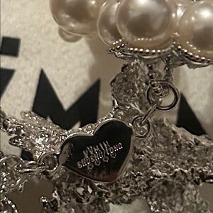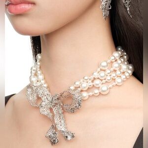 The necklace features layered strands of pearls in varying sizes arranged in an intertwined structure, adding depth and visual dimension. At the center, a finely crafted bow motif adds a lace-like elegance and softness. Through precise craftsmanship, the design recreates the airy, hollow texture of lace using metal and pearls, resulting in a piece that feels both sculptural and feminine. It serves not only as an accessory but also as a statement of style and individuality.