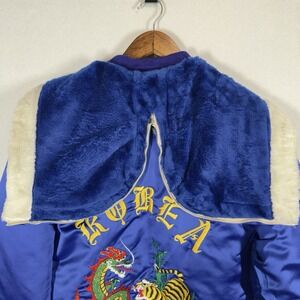 Vintage Sukajan Souvenir Jacket Korea Dragon Tiger Satin Blue Hooded Brad