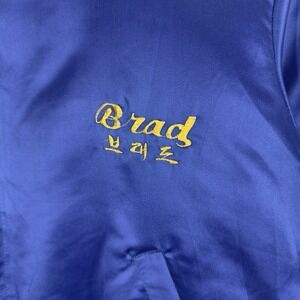 Vintage Sukajan-style souvenir jacket featuring bold dragon and tiger embroidery with "KOREA" lettering across the back. Cobalt blue satin shell with yellow embroidery, ribbed cuffs and hem, and a zip-off faux fur hood/lining. Front chest embroidery reads "Brad" with Korean script. Strong vintage character and classic military souvenir style.