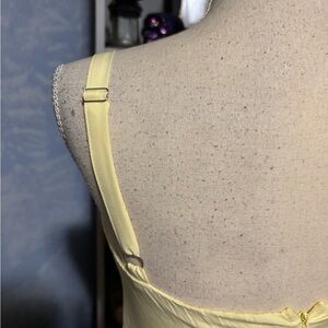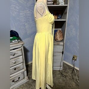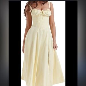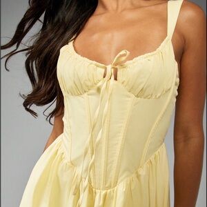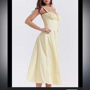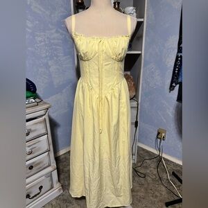Brand new with tags! Stunning soft yellow midi dress featuring a structured corset-style bodice with boning, adjustable straps, and a flattering flowy skirt.