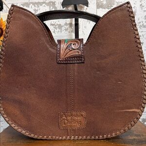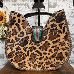 Bold leopard print shoulder bag by American Darling. Features tan and brown animal pattern with black spots. Decorative tab has turquoise and brown painted detail. Whipstitch trim and textured finish. Great statement piece for casual looks.