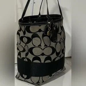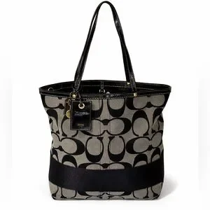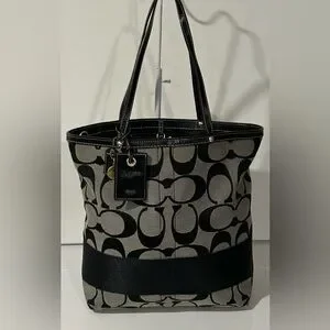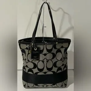 Authentic Coach Signature Canvas Tote Bag featuring the classic black and gray jacquard monogram with black leather trim and handles. This timeless Coach design is both stylish and functional, making it perfect for work, travel, or everyday use.