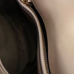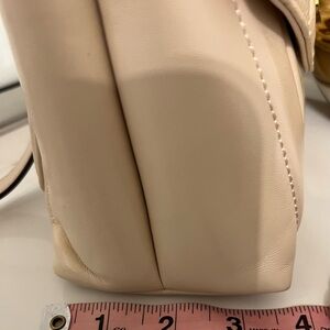 Chic cream Tory Burch satchel with quilted panels. Gold-tone hardware and logo detail. Top handle and removable chain strap for carry options. Structured silhouette for polished looks.