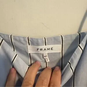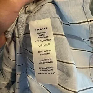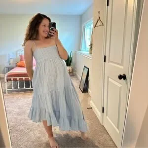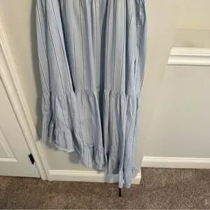 I adore this super flattering and adorable designer FRAME blue striped cotton/hemp square neck strappy tiered asymmetric hem maxi dress