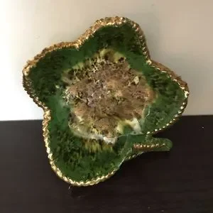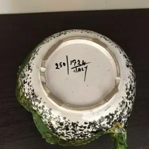 This is so unique and uniquely shaped. It is a vintage ceramic signed hand painted pottery bowl that is hand painted with real gold. It is made in Italy and it’s also numbered and signed. It measures about 9” wide