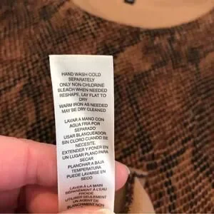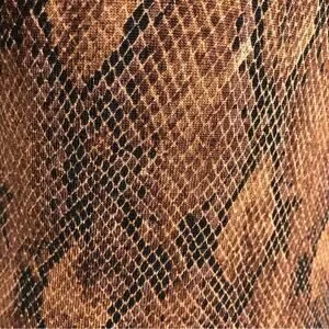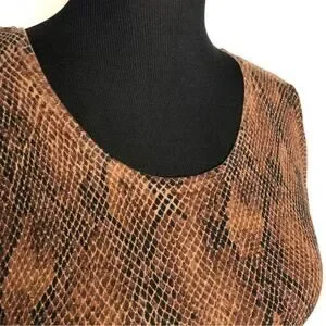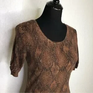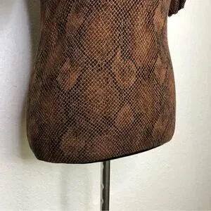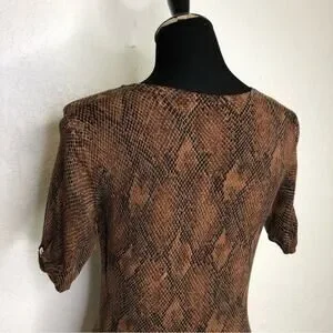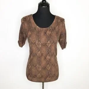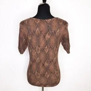 WHBM brown and black snakeskin python knit sweater top. Pullover style with scoop round neckline. Short sleeves with gathered button cuffs. Ribbed hemline. Size Small. Excellent preowned condition.