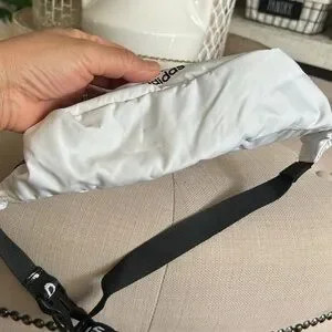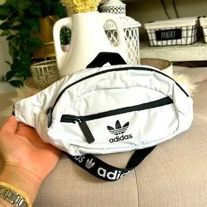 Sleek white belt bag with black accents. Features adidas logo. Adjustable strap for comfort.