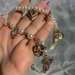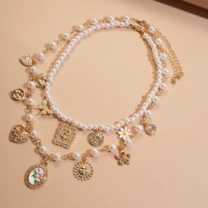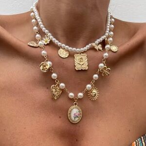 This exquisite necklace features a blend of gold charms and lustrous pearls, perfect for adding a touch of elegance to any outfit.