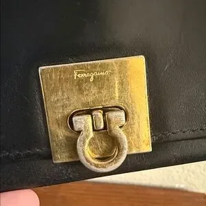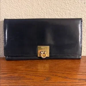 This item is a Salvatore Ferragamo Leather Continental Wallet featuring the brand's signature Gancini turn-lock closure in gold-tone hardware. This classic long wallet is typically crafted from high-quality leather, such as calfskin, and is designed with a sleek bifold or flap structure. Inside, these continental models often include multiple bill compartments, card slots, and a zippered coin pocket. Versions with this exact hardware were prominent in the 1990s through the early 2000s. The estimated MSRP was $595-695.