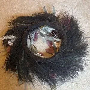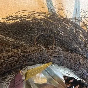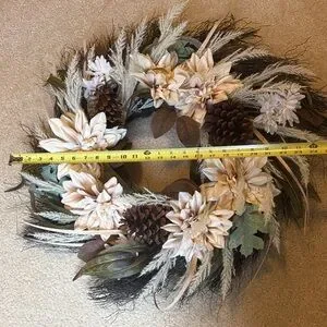 Elegant ivory floral wreath with brown pinecones and green foliage.