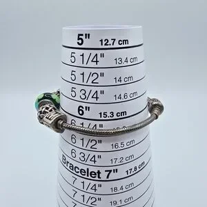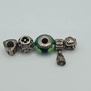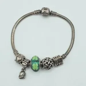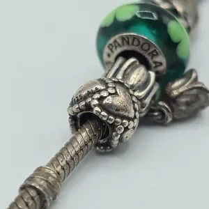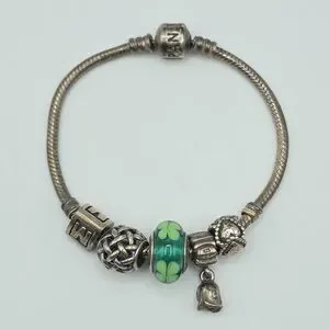 Bracelet and charms are in good, pre-owned condition. They exhibit normal surface wear, consistent with use. Some minor surface scratches visible and patina is present, typical of use and storage. No attempt has been made to clean or polish. No damage to clasp and bracelet opens and closes securely. Murano glass charm is intact with no visible chips or cracks. Any condition notes are also pictured. Please review all photos prior to purchase.