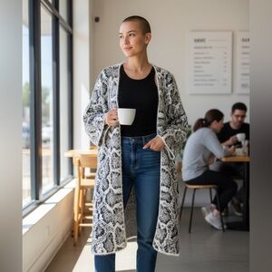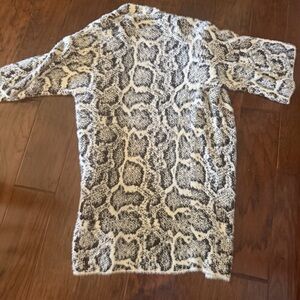 Open-front cardigan with bold snake pattern. Soft knit texture. Neutral ivory base with gray snake markings. Easy to layer over casual outfits.