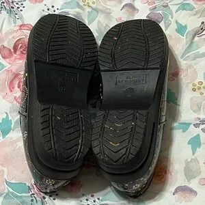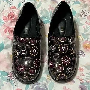 Clogs are black slip-on clogs with a medium-height heel, arch support, and non-slip soles. They are designed for nurses but can be worn by anyone who is on their feet all day. The shoes have a faux leather upper and lining that makes them easy to clean.