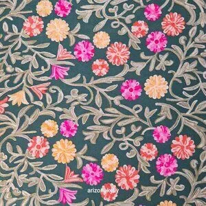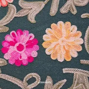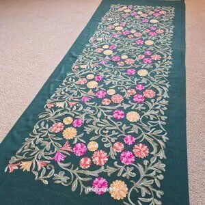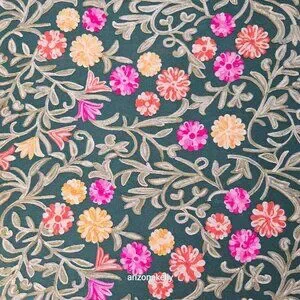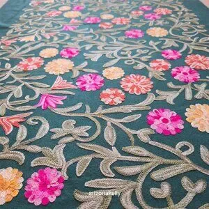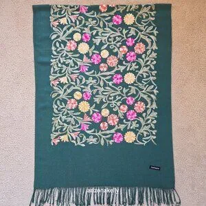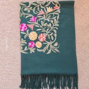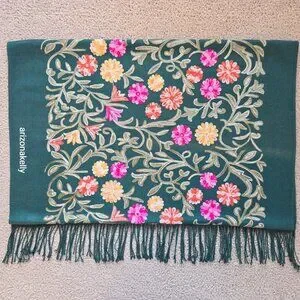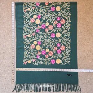 Green "Cashmere" Scarf with Chain Stitch Embroidery Flowers and Leaves