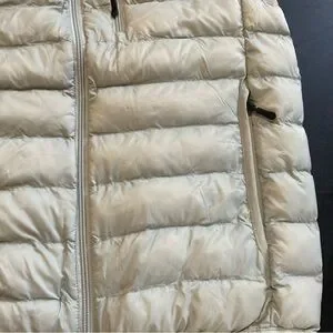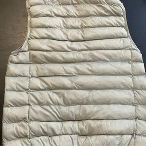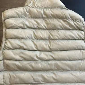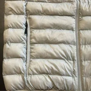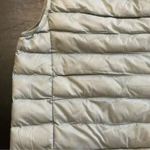 Sleek silver puffer vest with front zipper. Ideal for cool weather.