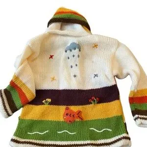 Hand knit sweater . It’s absolutely adorable. Spring animals on back and front . Zipper runs smoothly . Unisex