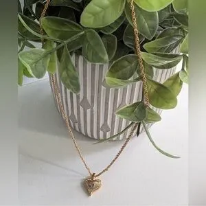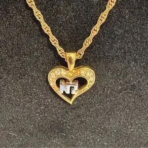 Charming gold heart necklace by Nina Ricci. Perfect for adding elegance. This item is a Nina Ricci vintage heart pendant necklace featuring a gold-toned rope chain and a pendant with rhinestone accents.