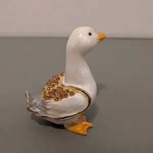 Charming white and orange duck trinket box with sparkling jewel accents. Features a secure hinged design for small keepsakes. Smooth enamel finish for a polished look. Ideal as a decorative accent or gift for bird lovers.
