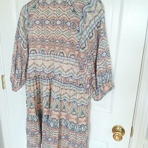 Cream dress featuring a soft, draped bodice. Narrow neckline band with a colorful, painterly trim. Subtle gathered detailing under the trim. Feminine and versatile styling.