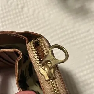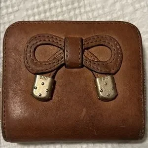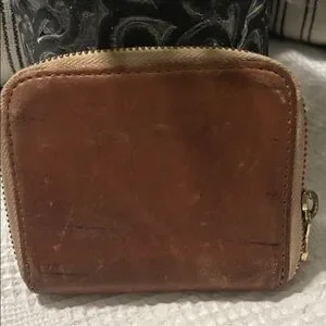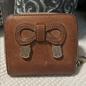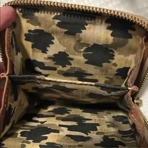 Elegant tan leather card holder. Features subtle branding. Sleek and functional. See pictures for call outs. Still in great condition.