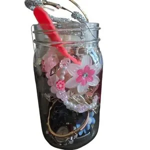 Preppy themed jewelry jar lot contains a curated variety of accessories including earrings, watches, pins, ribbons, and designer-inspired pieces. This 1lb collection features a mix of textures and styles like rose quartz beads, floral motifs, and metallic accents. Items will be removed from the glass jar and shipped in a secure ziplock bag to ensure safe transit and lower shipping costs. Perfect for crafters, resellers, or those looking to expand their accessory collection with a feminine, preppy aesthetic.