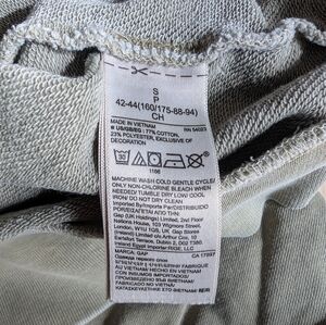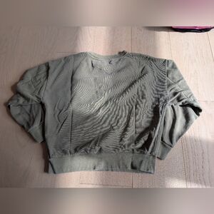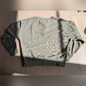 Three-button henley neckline. Soft olive tone. Ribbed collar and subtle texture. Easy, casual layer. Many pictures are posted as the colour is hard to capture!