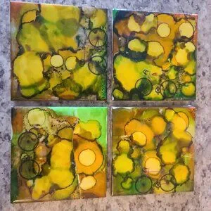 Set of 4 coasters. Hand painted from a studio in Ontario, Canada. No wear or chips on top however note in 2nd photo that the cork bottoms have slight wear.