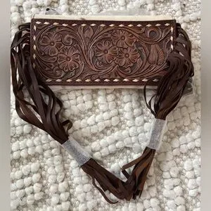 Stylish brown leather bag with intricate floral design and fringe detailing. Perfect for adding a touch of elegance to any outfit.