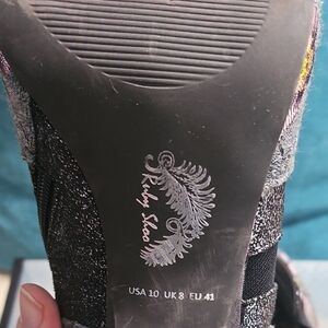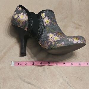 Ruby Shoo gray ankle booties featuring a soft floral pattern in pink and cream. Side zipper closure for easy wear and a flattering heel for a polished look. Perfect for dressing up jeans or a skirt with feminine flair. May have been worn 1 or two times. Will be shipped in plastic box as do not have original box. Please review pictures and ask any questions. Offers welcome and bundle and save.
