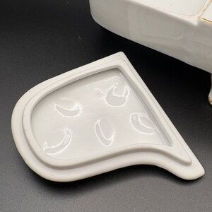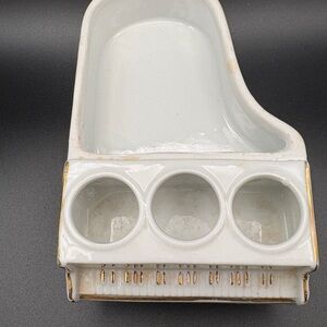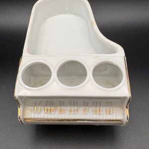 Elegant white porcelain grand piano toothpick holder with hand-painted pink and yellow floral accents. Features gold trim for a refined look. A charming decorative accent that adds vintage-inspired style to tabletops. Includes pink floral detail and white porcelain finish.
